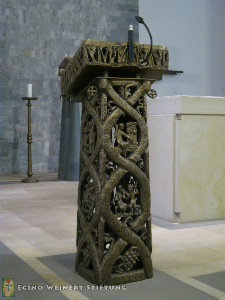 In dieser Kapelle finden wir einen Ambo, einen Tabernakel und ein Hängekreuz über dem Altar von Egino Weinert.